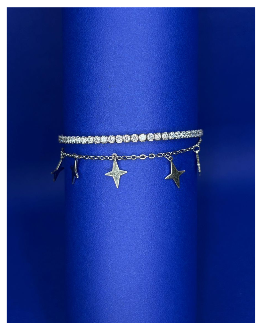 Illuminate your style with the Double Layer Star Charms Adjustable Tennis Bracelet. This exquisite piece features two elegantly layered strands: a tennis bracelet adorned with a line of radiant, dazzling stones and a delicate chain embellished with shimmering star-shaped charms. Each star dangles gracefully, capturing the light with every movement and evoking a sense of celestial glamour.