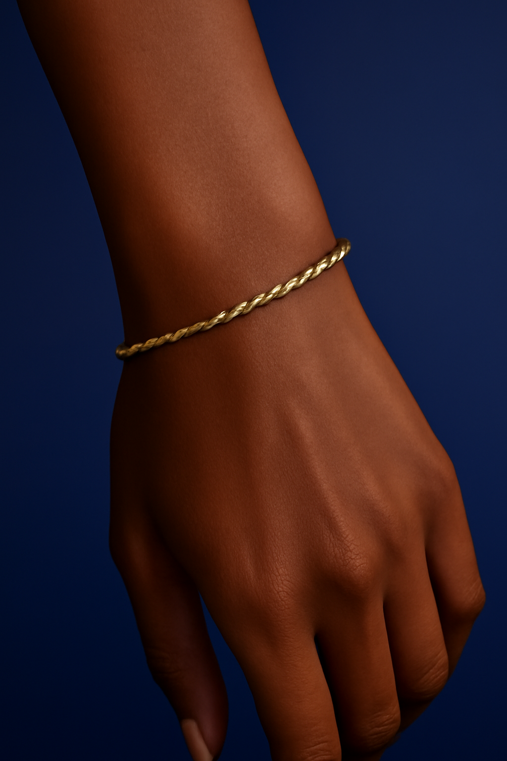 Discover understated sophistication with the Thin Magic Twirl Bracelet. Meticulously crafted, this bracelet features a slender, twisted chain design—a timeless detail that radiates subtle luxury and refined elegance. Light dances off every curve of its radiant gold finish, making it a perfect statement piece whether worn alone or layered with your favorite bangles.